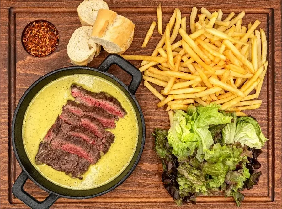 Signature Entrecôte sauce, tender meats, warm baguettes, crispy fries, French desserts, and cozy rooftop vibes in between.